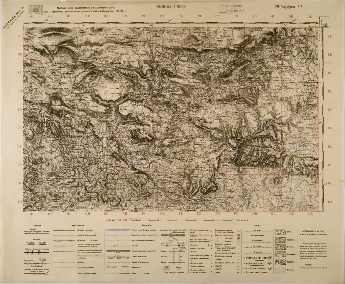 "Carta realizzata dall' IGM mediante ingrandimento della carta alla scala di 1:80.000 dell' Istituto Geografico Francese, edizione 1936 stampa 1937"