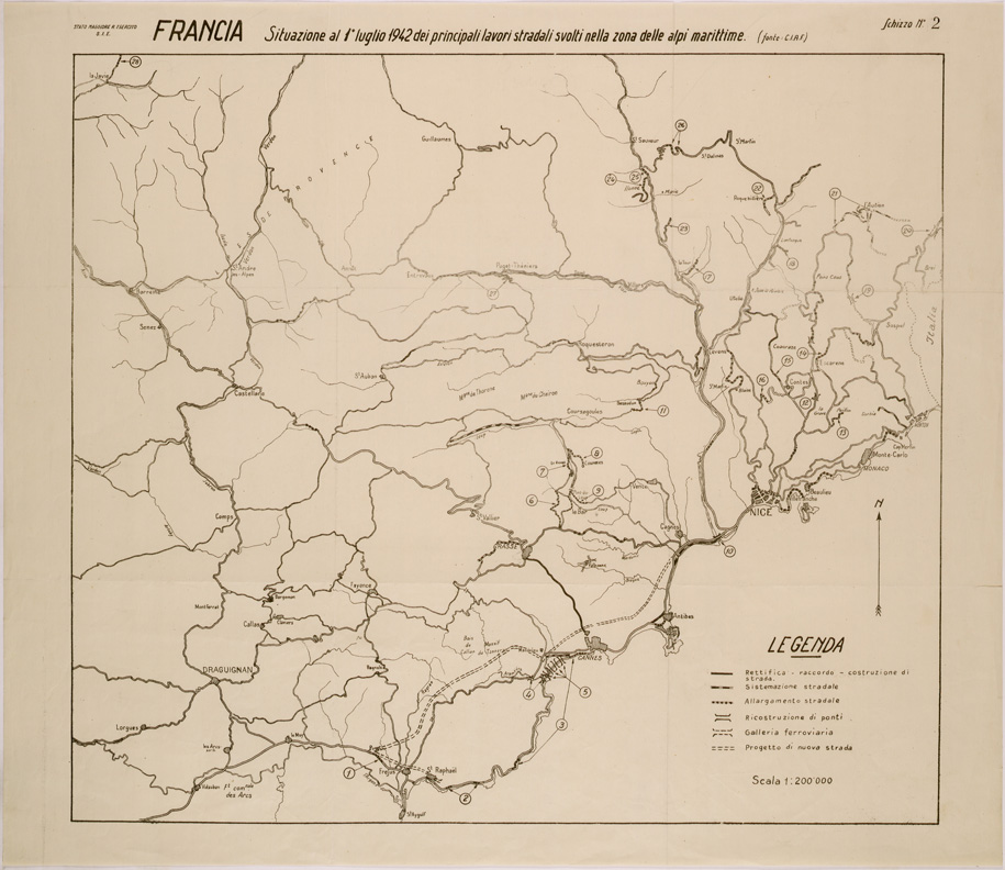 LAVORI STRADALI NEL SETTORE ALPI MARITTIME (FRANCIA) SCHIZZO N 2 SITUAZIONE AL 1° LUGLIO 1942
