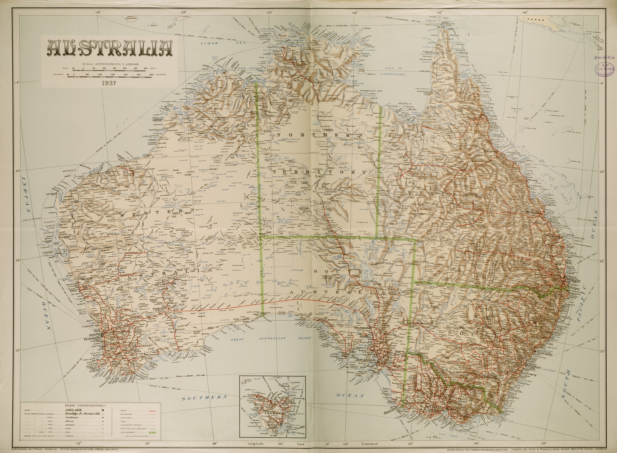 "Carta compilata nel 1937 dal dipartimento dell' interno di Canberra, riprodotta dall' IGM e stampata nel 1942"