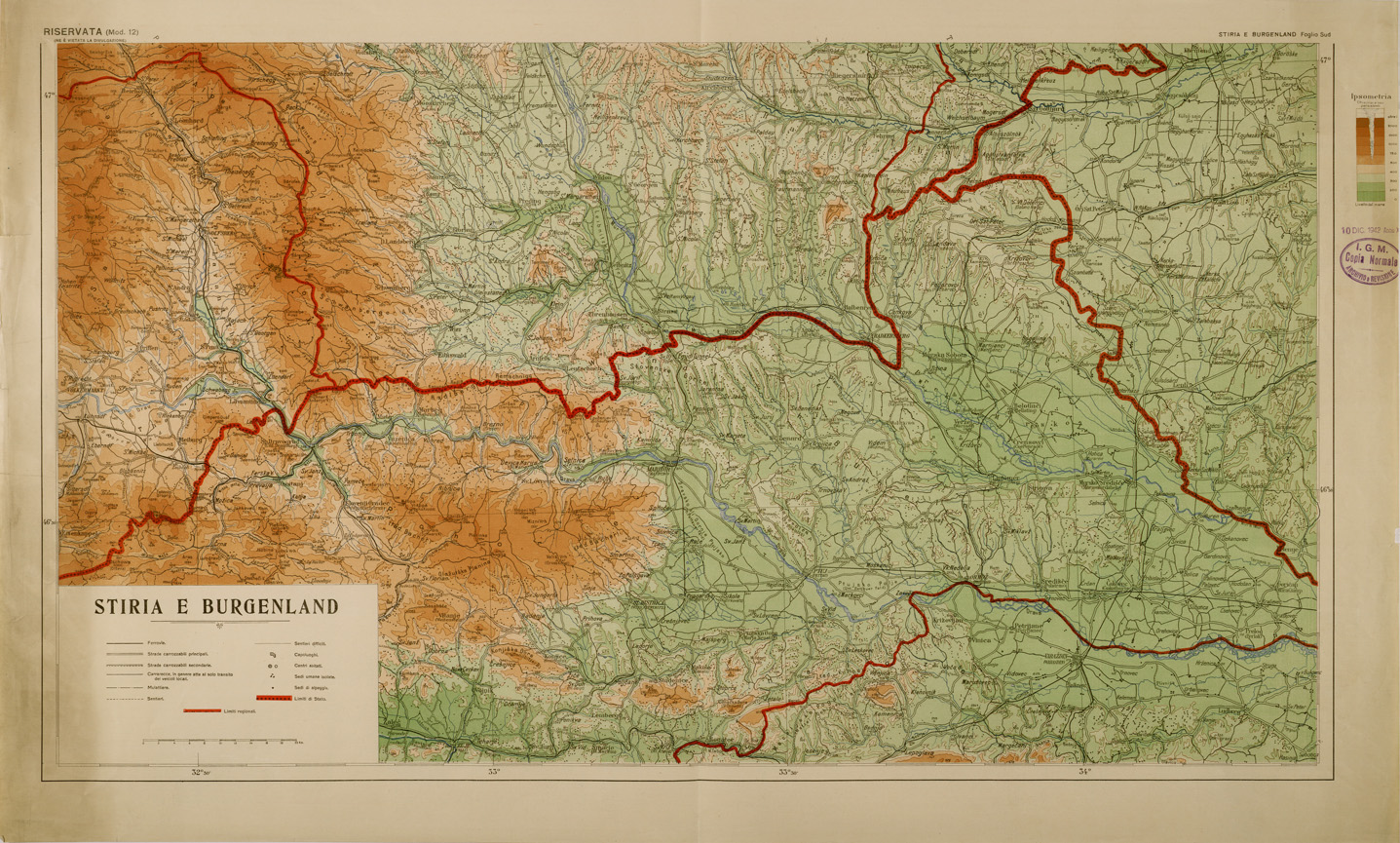 "Carta dimostrativa dei territori limitrofi alla frontiera nord - orientale in due fogli ( Nord - Sud ) realizzata dall' Ufficio Monografie dell' IGM"
