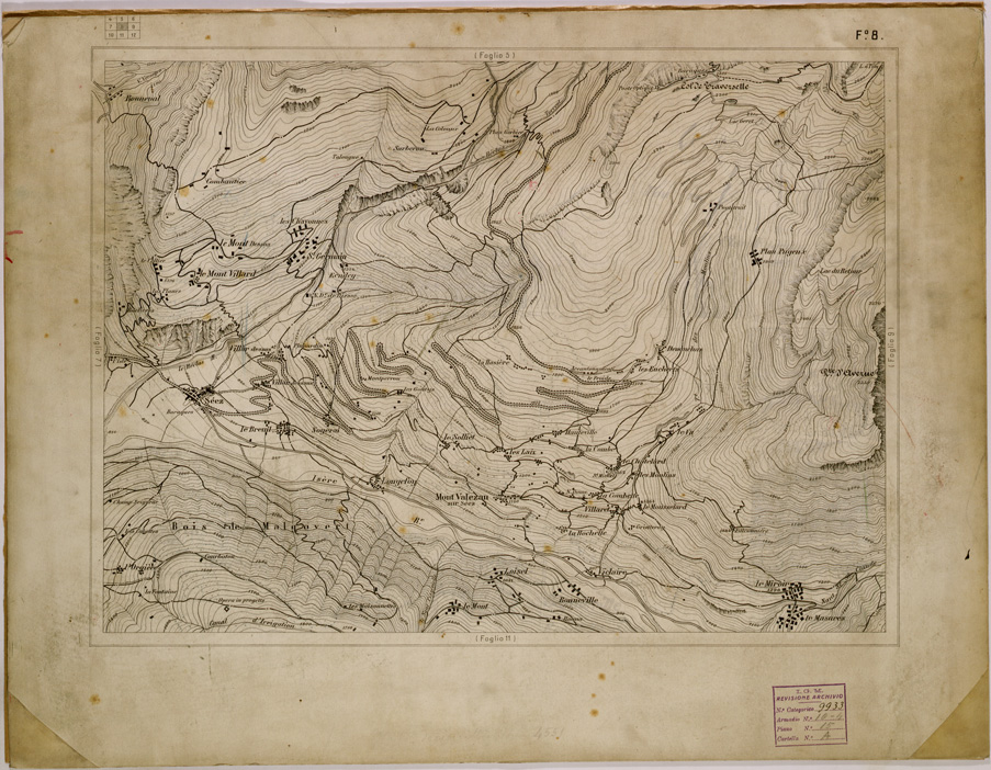 "Carta speciale divisa in 12 fogli la maggior parte dei quali andata perduta durante la guerra 1940 - 1945 rimangono solo i fogli 8 - 10 - 12 disegnata a penna su cartone la carta è stata compilata mediante ingrandimento dei rilievi al 50.000 per la parte Italiana e della " carte de la frontiere des alpes " alla scala di 80.000 per il territorio Francese."