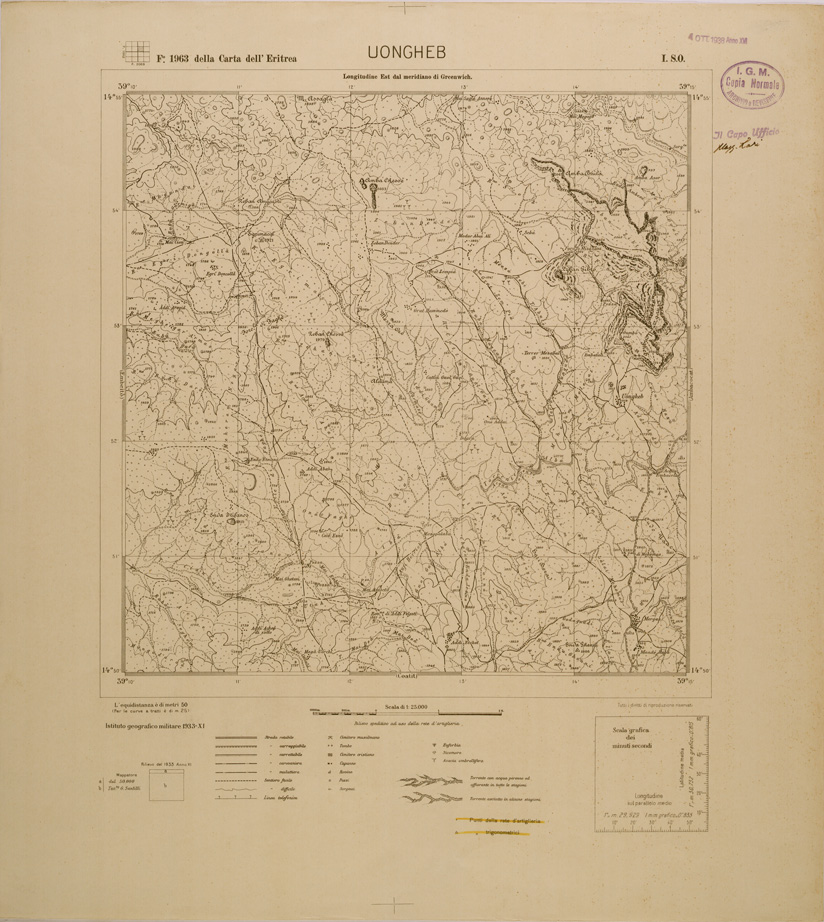 "Carta realizzata dall' IGM da rilievi eseguiti dall' Ufficio Topocartografico dell' Eritrea allo scopo di raffittire la rete geodetica e mettere in evidenza i punti della rete di artiglieria."