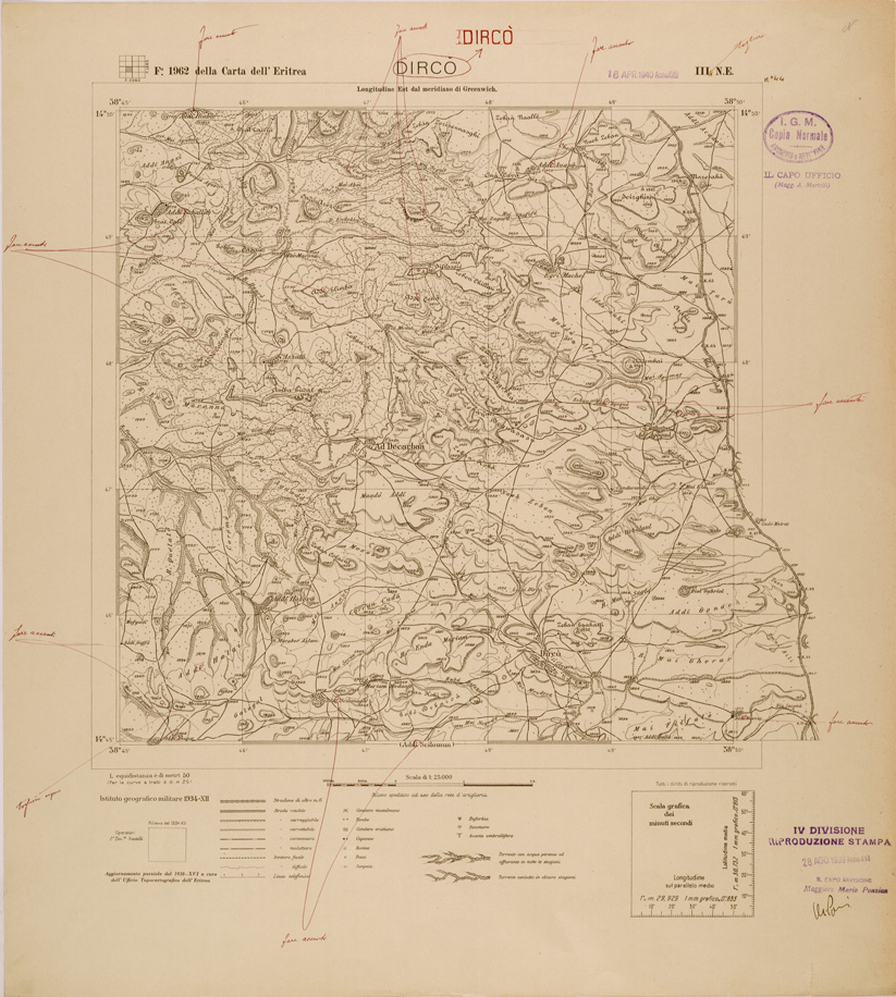 "Carta realizzata dall' IGM da rilievi eseguiti dall' Ufficio Topocartografico dell' Eritrea allo scopo di raffittire la rete geodetica e mettere in evidenza i punti della rete di artiglieria."