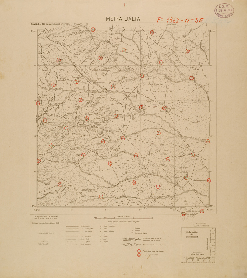 "Carta realizzata dall' IGM da rilievi eseguiti dall' Ufficio Topocartografico dell' Eritrea allo scopo di raffittire la rete geodetica e mettere in evidenza i punti della rete di artiglieria."