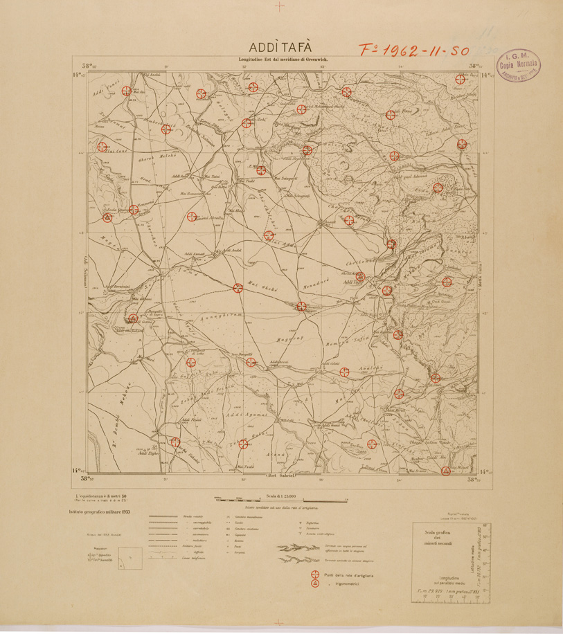 "Carta realizzata dall' IGM da rilievi eseguiti dall' Ufficio Topocartografico dell' Eritrea allo scopo di raffittire la rete geodetica e mettere in evidenza i punti della rete di artiglieria."