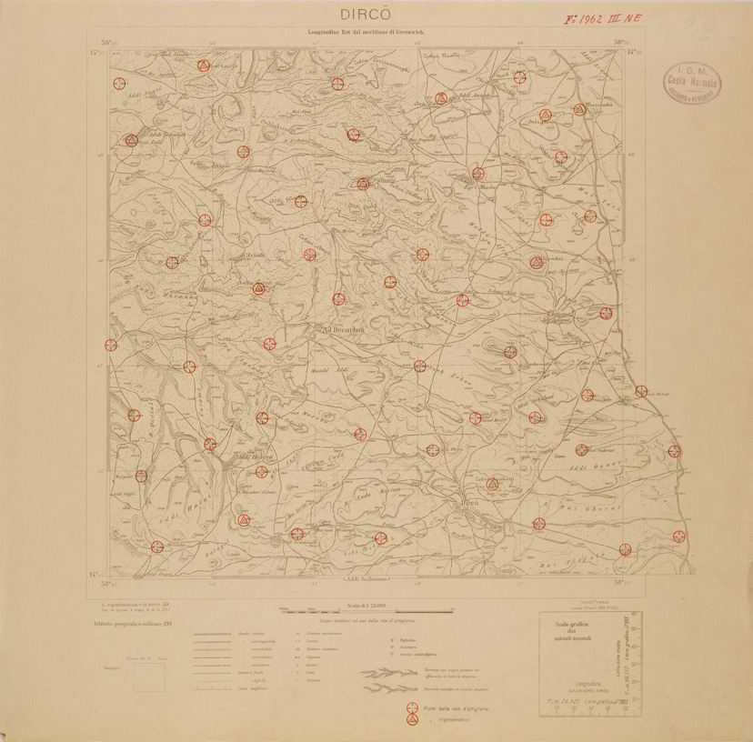 "Carta realizzata dall' IGM da rilievi eseguiti dall' Ufficio Topocartografico dell' Eritrea allo scopo di raffittire la rete geodetica e mettere in evidenza i punti della rete di artiglieria."