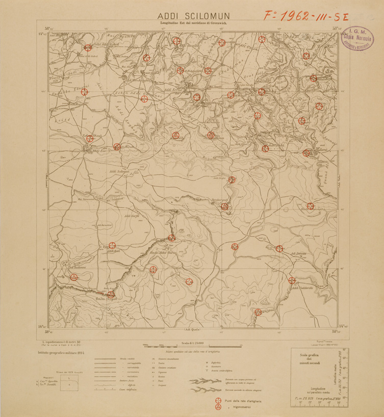 "Carta realizzata dall' IGM da rilievi eseguiti dall' Ufficio Topocartografico dell' Eritrea allo scopo di raffittire la rete geodetica e mettere in evidenza i punti della rete di artiglieria."