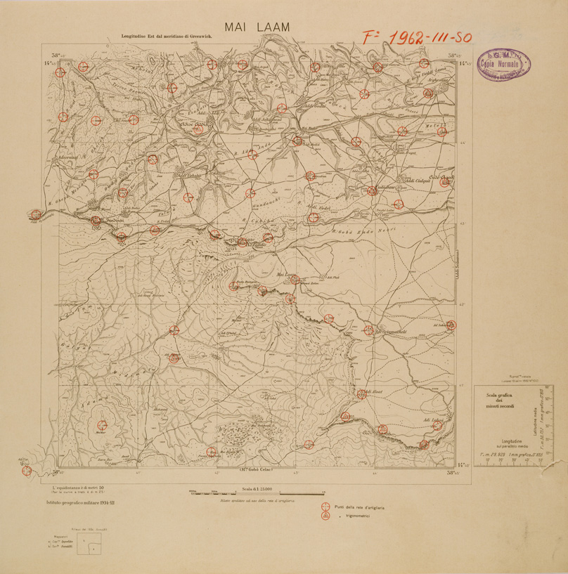 "Carta realizzata dall' IGM da rilievi eseguiti dall' Ufficio Topocartografico dell' Eritrea allo scopo di raffittire la rete geodetica e mettere in evidenza i punti della rete di artiglieria."