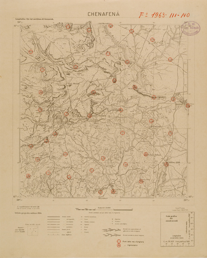 "Carta realizzata dall' IGM da rilievi eseguiti dall' Ufficio Topocartografico dell' Eritrea allo scopo di raffittire la rete geodetica e mettere in evidenza i punti della rete di artiglieria."