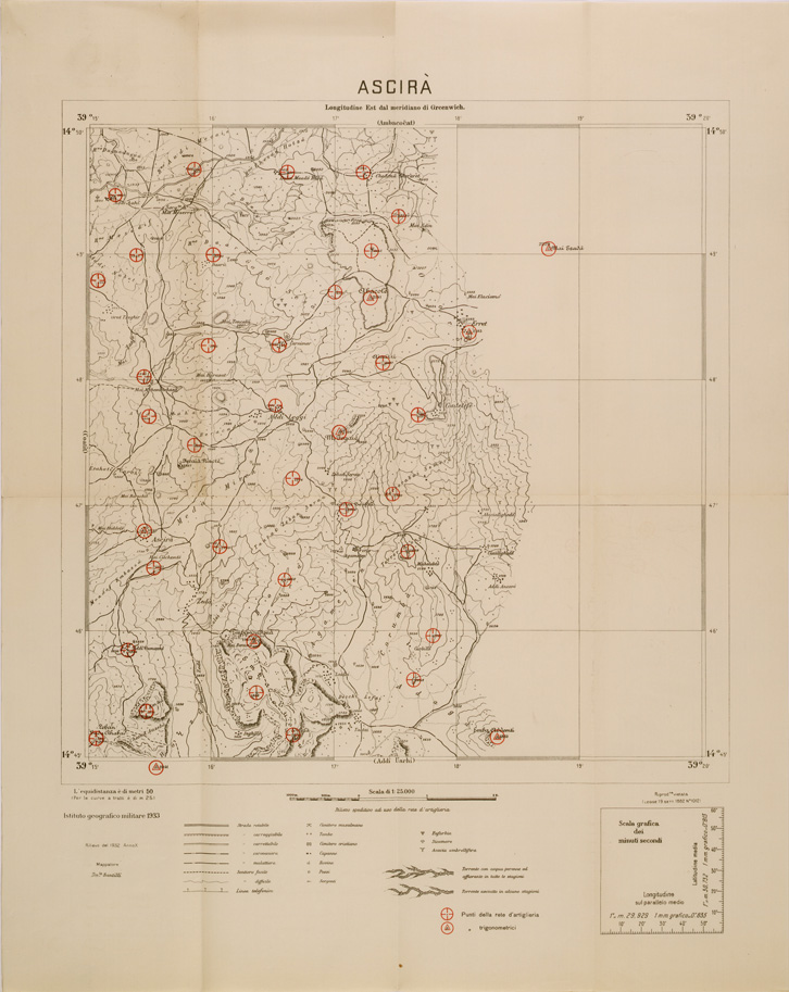 "Carta realizzata dall' IGM da rilievi eseguiti dall' Ufficio Topocartografico dell' Eritrea allo scopo di raffittire la rete geodetica e mettere in evidenza i punti della rete di artiglieria."