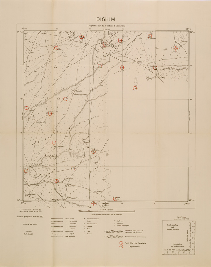 "Carta realizzata dall' IGM da rilievi eseguiti dall' Ufficio Topocartografico dell' Eritrea allo scopo di raffittire la rete geodetica e mettere in evidenza i punti della rete di artiglieria."
