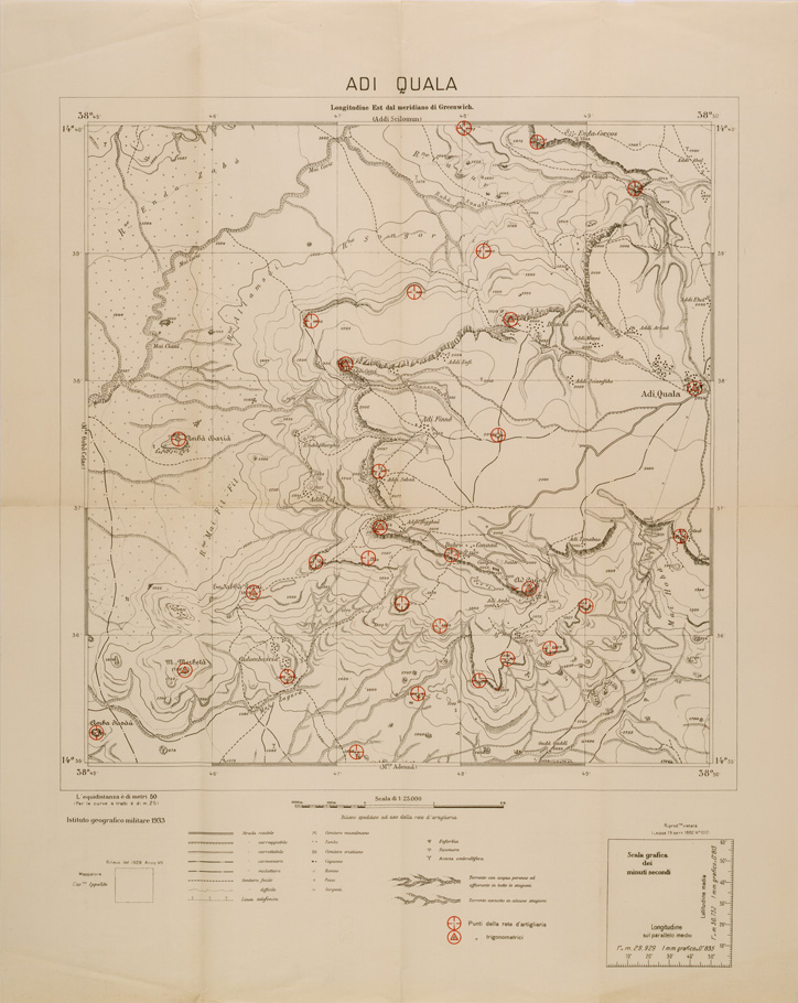 "Carta realizzata dall' IGM da rilievi eseguiti dall' Ufficio Topocartografico dell' Eritrea allo scopo di raffittire la rete geodetica e mettere in evidenza i punti della rete di artiglieria."