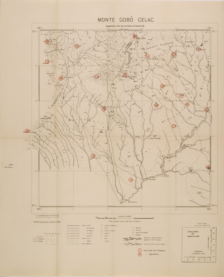 "Carta realizzata dall' IGM da rilievi eseguiti dall' Ufficio Topocartografico dell' Eritrea allo scopo di raffittire la rete geodetica e mettere in evidenza i punti della rete di artiglieria."