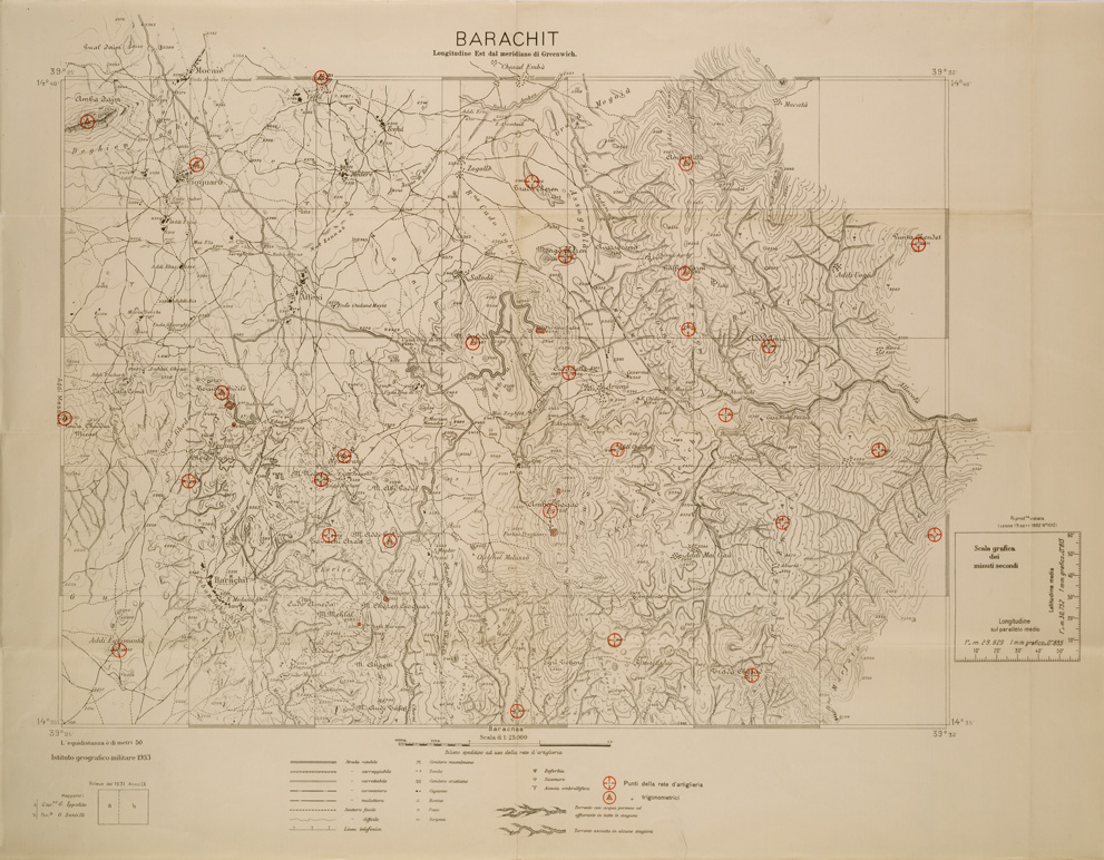 "Carta realizzata dall' IGM da rilievi eseguiti dall' Ufficio Topocartografico dell' Eritrea allo scopo di raffittire la rete geodetica e mettere in evidenza i punti della rete di artiglieria."