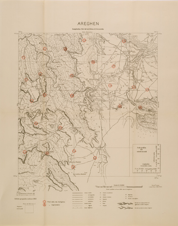 "Carta realizzata dall' IGM da rilievi eseguiti dall' Ufficio Topocartografico dell' Eritrea allo scopo di raffittire la rete geodetica e mettere in evidenza i punti della rete di artiglieria."