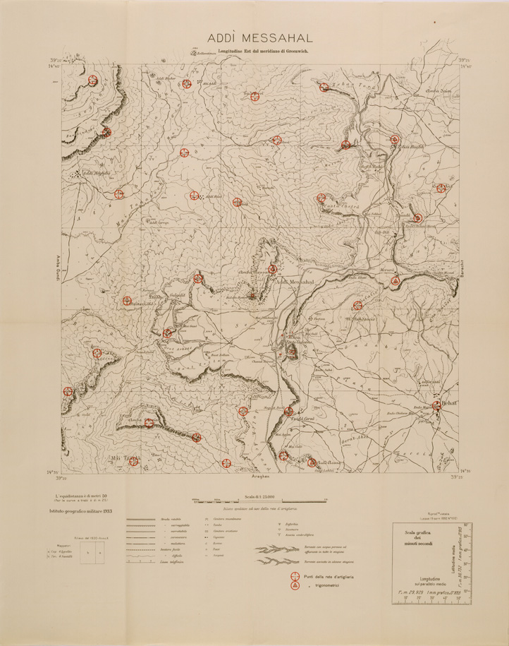 "Carta realizzata dall' IGM da rilievi eseguiti dall' Ufficio Topocartografico dell' Eritrea allo scopo di raffittire la rete geodetica e mettere in evidenza i punti della rete di artiglieria."