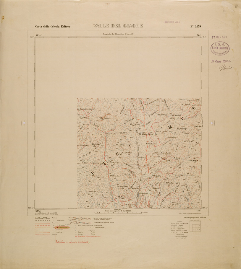 "Carta realizzata fondandosi su operazioni di rilievo eseguite al 50.000 e riprese successivamente al 100.000, impiegando la proiezione policentrica. Con le nuove levate e la riduzione di quelle al 50.000 venne allestita la "Carta topografica dell'Eritrea al 100.000" in 36 fogli,compreso il titolo. Ogni foglio corrisponde ad un trapezio di 20' latitudine per 20' longitudine..."