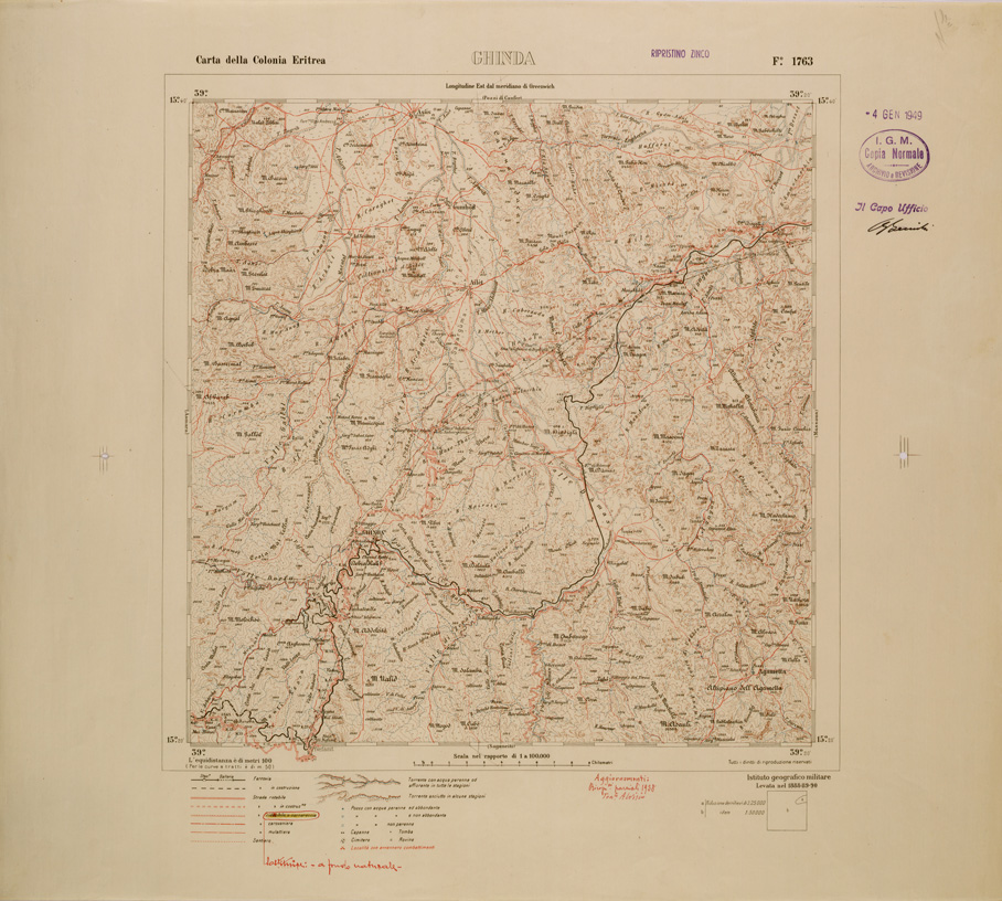"Carta realizzata fondandosi su operazioni di rilievo eseguite al 50.000 e riprese successivamente al 100.000, impiegando la proiezione policentrica. Con le nuove levate e la riduzione di quelle al 50.000 venne allestita la "Carta topografica dell'Eritrea al 100.000" in 36 fogli,compreso il titolo. Ogni foglio corrisponde ad un trapezio di 20' latitudine per 20' longitudine..."