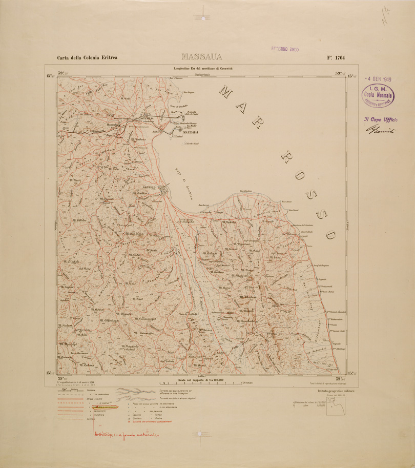 "Carta realizzata fondandosi su operazioni di rilievo eseguite al 50.000 e riprese successivamente al 100.000, impiegando la proiezione policentrica. Con le nuove levate e la riduzione di quelle al 50.000 venne allestita la "Carta topografica dell'Eritrea al 100.000" in 36 fogli,compreso il titolo. Ogni foglio corrisponde ad un trapezio di 20' latitudine per 20' longitudine..."