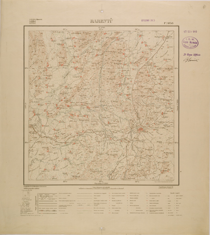 "Carta realizzata fondandosi su operazioni di rilievo eseguite al 50.000 e riprese successivamente al 100.000, impiegando la proiezione policentrica. Con le nuove levate e la riduzione di quelle al 50.000 venne allestita la "Carta topografica dell'Eritrea al 100.000" in 36 fogli,compreso il titolo. Ogni foglio corrisponde ad un trapezio di 20' latitudine per 20' longitudine..."