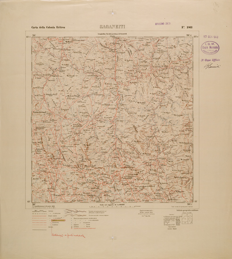"Carta realizzata fondandosi su operazioni di rilievo eseguite al 50.000 e riprese successivamente al 100.000, impiegando la proiezione policentrica. Con le nuove levate e la riduzione di quelle al 50.000 venne allestita la "Carta topografica dell'Eritrea al 100.000" in 36 fogli,compreso il titolo. Ogni foglio corrisponde ad un trapezio di 20' latitudine per 20' longitudine..."