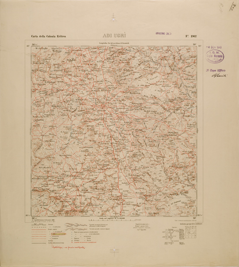 "Carta realizzata fondandosi su operazioni di rilievo eseguite al 50.000 e riprese successivamente al 100.000, impiegando la proiezione policentrica. Con le nuove levate e la riduzione di quelle al 50.000 venne allestita la "Carta topografica dell'Eritrea al 100.000" in 36 fogli,compreso il titolo. Ogni foglio corrisponde ad un trapezio di 20' latitudine per 20' longitudine..."