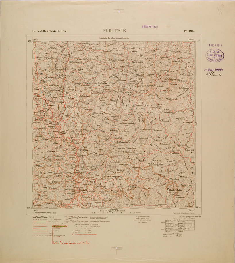 "Carta realizzata fondandosi su operazioni di rilievo eseguite al 50.000 e riprese successivamente al 100.000, impiegando la proiezione policentrica. Con le nuove levate e la riduzione di quelle al 50.000 venne allestita la "Carta topografica dell'Eritrea al 100.000" in 36 fogli,compreso il titolo. Ogni foglio corrisponde ad un trapezio di 20' latitudine per 20' longitudine..."