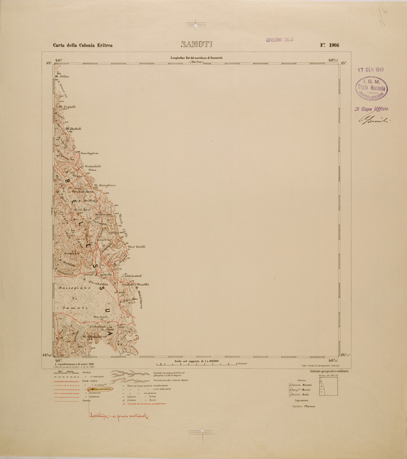 "Carta realizzata fondandosi su operazioni di rilievo eseguite al 50.000 e riprese successivamente al 100.000, impiegando la proiezione policentrica. Con le nuove levate e la riduzione di quelle al 50.000 venne allestita la "Carta topografica dell'Eritrea al 100.000" in 36 fogli,compreso il titolo. Ogni foglio corrisponde ad un trapezio di 20' latitudine per 20' longitudine..."