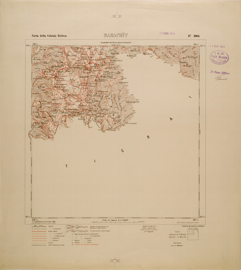 "Carta realizzata fondandosi su operazioni di rilievo eseguite al 50.000 e riprese successivamente al 100.000, impiegando la proiezione policentrica. Con le nuove levate e la riduzione di quelle al 50.000 venne allestita la "Carta topografica dell'Eritrea al 100.000" in 36 fogli,compreso il titolo. Ogni foglio corrisponde ad un trapezio di 20' latitudine per 20' longitudine..."