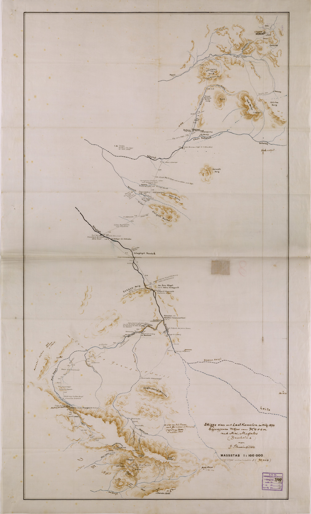 "Schizzo del Professor Schweinfurth disegnato con inchiostri colorati su carta telata."