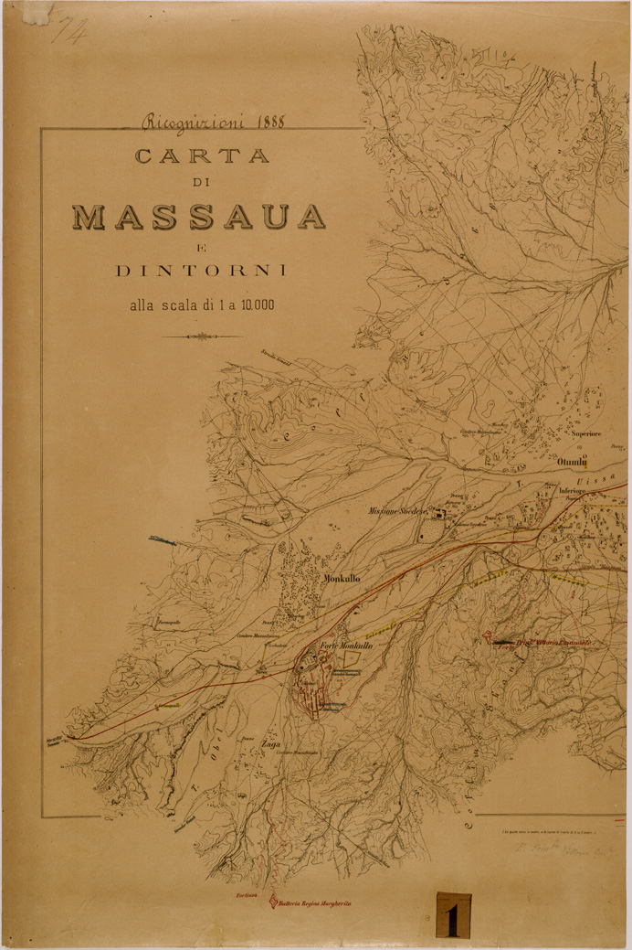 "Originali del rilievo eseguito nel 1885 e aggiornato nel 1888 della zona tra Massaua, Monkullo e Otumlo, questi rilievi iniziarono subito dopo l' occupazione militare di Massaua e furono l' inizio dei lavori topografici dell' IGM nella Colonia Eritrea."