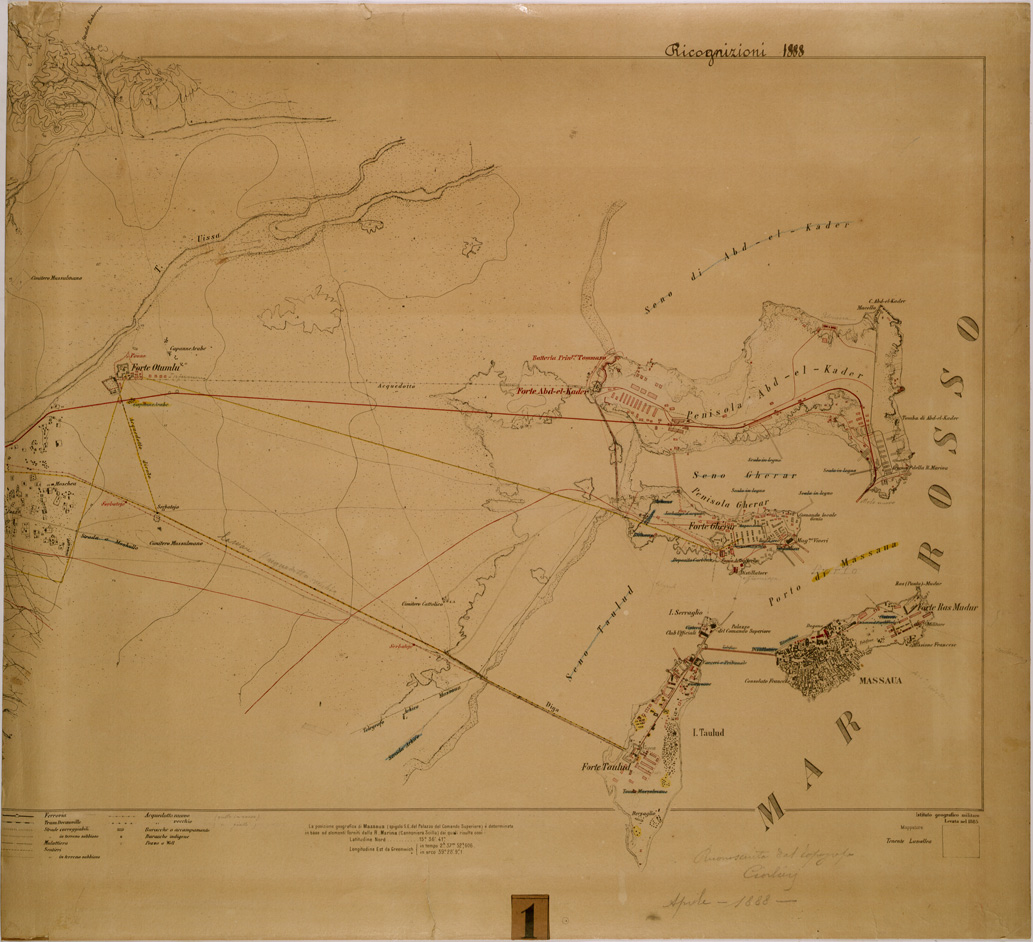 "Originali del rilievo eseguito nel 1885 e aggiornato nel 1888 della zona tra Massaua, Monkullo e Otumlo, questi rilievi iniziarono subito dopo l' occupazione militare di Massaua e furono l' inizio dei lavori topografici dell' IGM nella Colonia Eritrea."