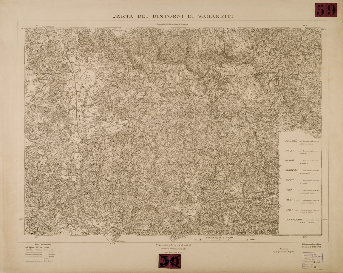 "Rilievo eseguito nel 1907 - 1908 nell' angolo sud - est della carta sono riportati i Capoluoghi di Distretto."