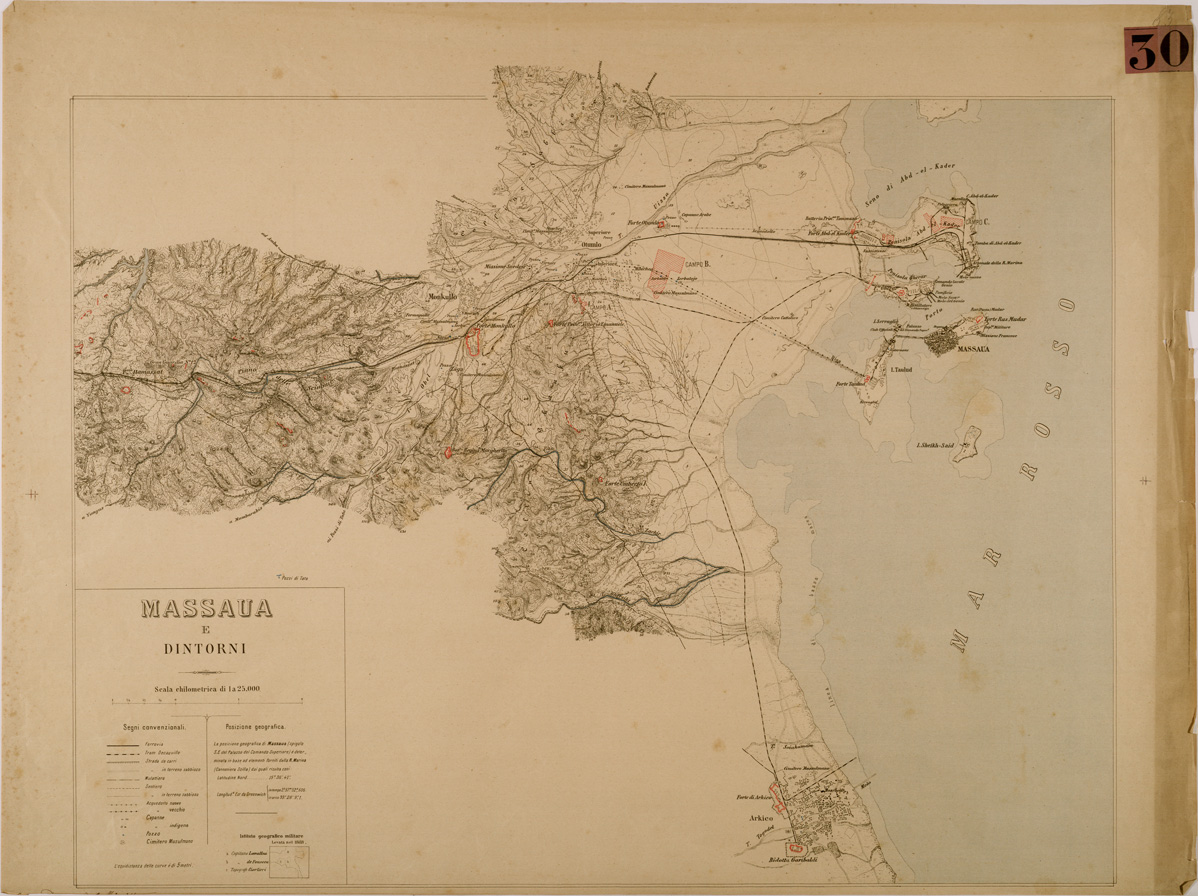 "Carta in 2 fogli ( titolati Massaua e dintorni e Saati - Dogali ) rilevata nel 1888 originariamente stampata in nero fu riprodotta a colori e inserita nella Rivista Militare Italiana del Settembre 1888 per accompagnare la relazione ufficiale della campagna di guerra per la rioccupazione di Saati ( 1887 - 1888 ) questi rilievi e quelli alla scala di 1:10.000 della zona intorno a Massaua furono poi impiegati nell' allestimento della carta alla scala di 1:50.000 della Colonia Eritrea. Questa edizione riporta stampate in rosso le fortificazioni militari."