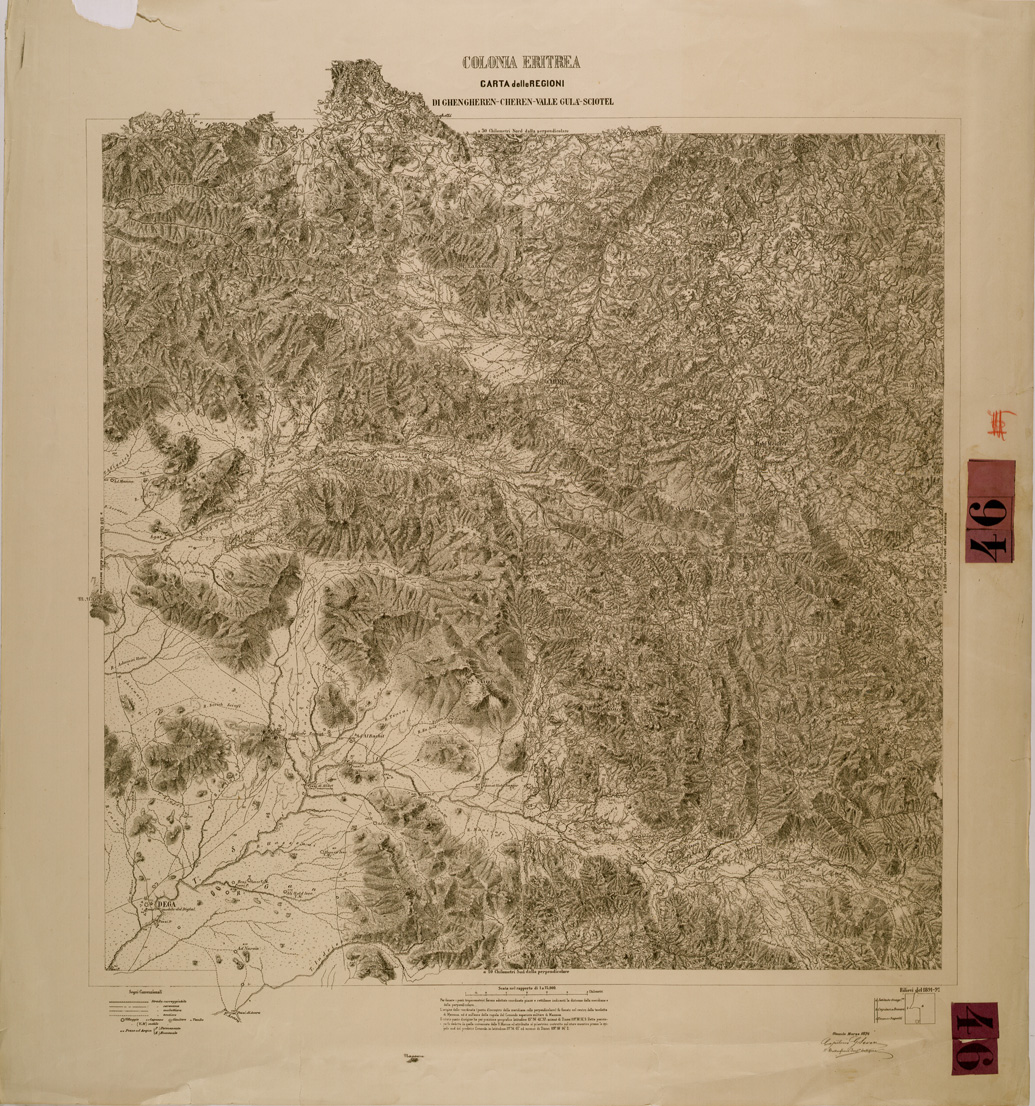 "Rilievo del 1891-92 a cura di ufficiali topografi I.G.M. e completati nel 1894 dal cap. Severi e dal ten. Sapelli del I Batt. Fanteria Indigena. Il terreno è rappresentato con molta evidenza grazie al tratteggio a luce zenitale..."
