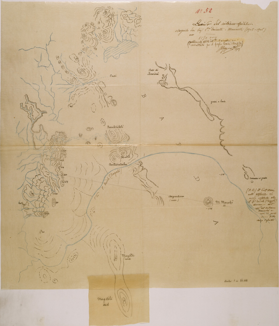 "Il presente lucido del rilievo dei professori Dainelli e Marinelli, è stato utilizzato per la compilazione del foglio Baia d'Anfile 1:400.000, quale rettifica del corso del fiume Endeli che, assicura Marinelli, scorre ad Est del vulcano Maraho e non ad Ovest, come dallo schizzo Oglietti."