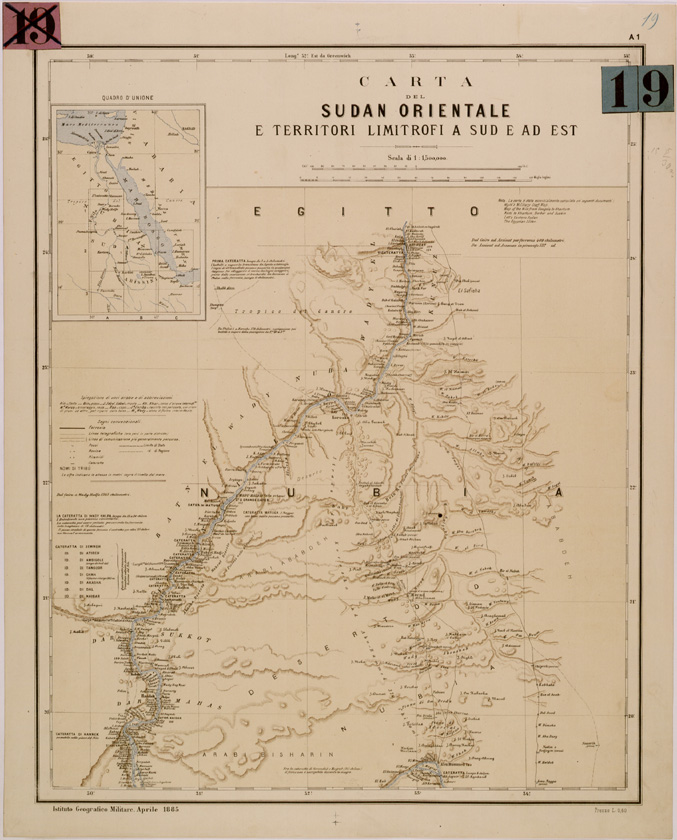 "La carta contiene varie legende relative a caratteristiche fisiche, viabilità della regione, regime e navigabilità del fiume Nilo."
