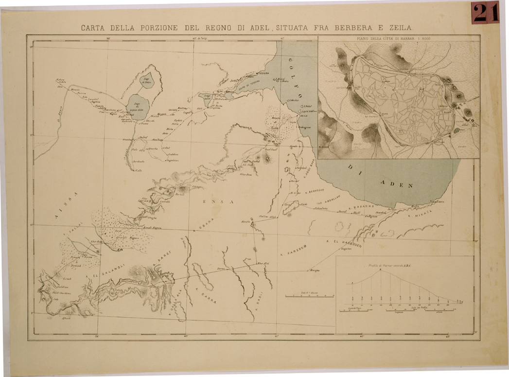 "Nella carta sono inseriti una pianta di Harrar alla scala di 1:8.000 ed un profilo altimetrico."