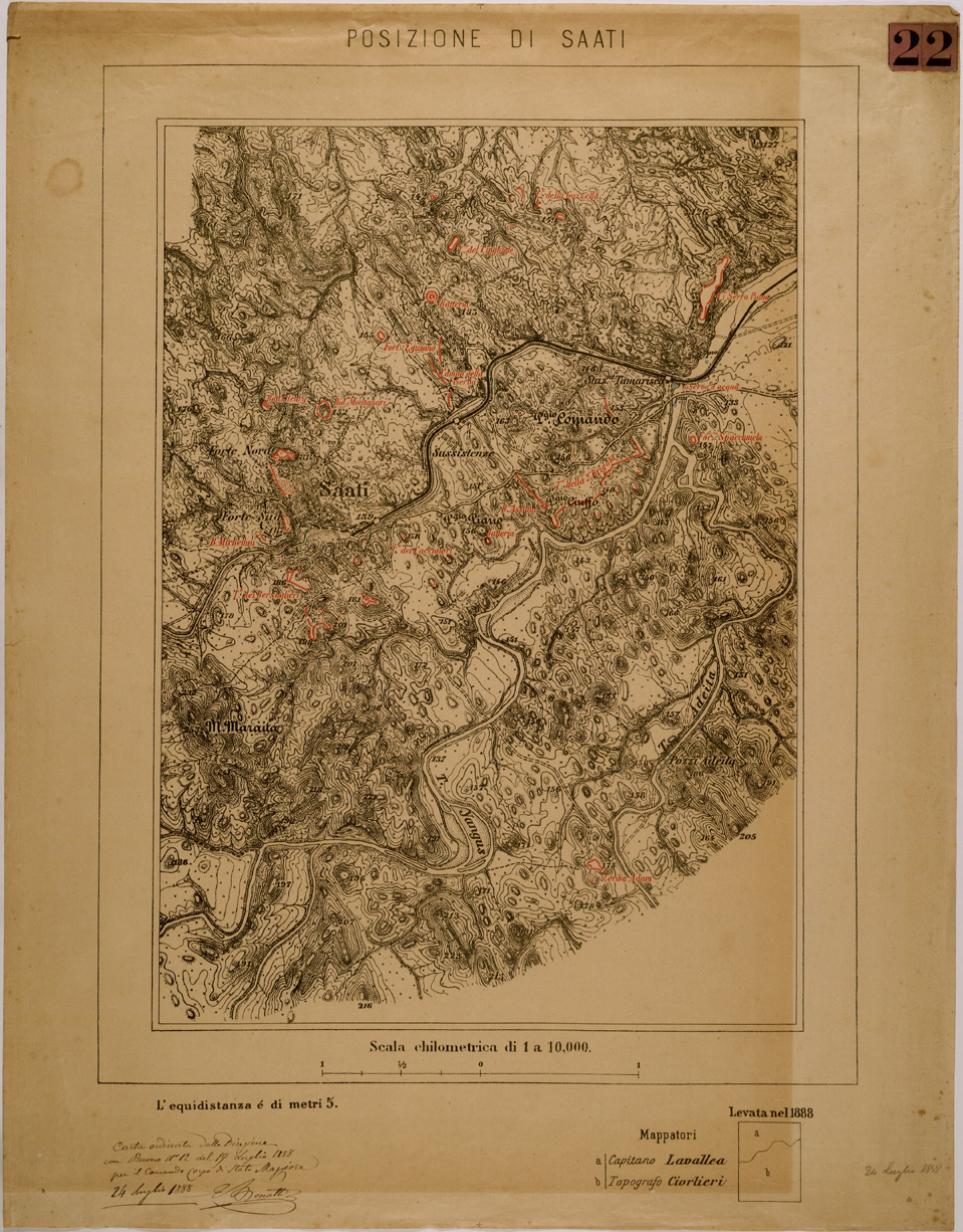 I rilevamenti topografici per la realizzazione della “Carta d´Italia&lrquo” iniziarono nel 1878: si trattava di un´opera così importante e lodevole che meritò la consapevole attenzione, non solo degli addetti ai lavori e delle categorie professionali coinvolte, ma anche delle più alte autorità del Regno.