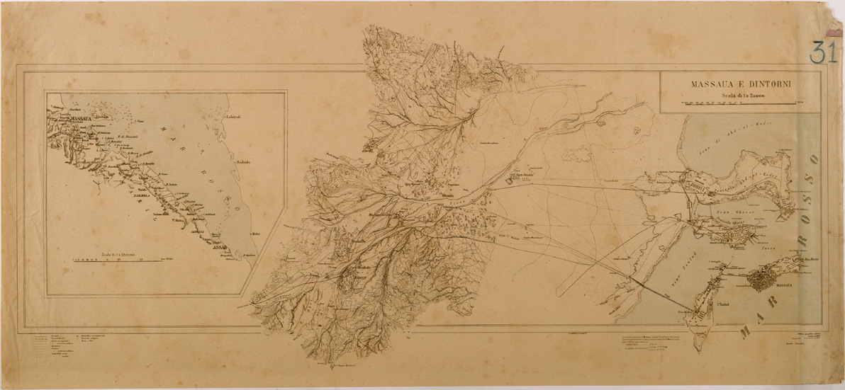 "Riduzione dal rilievo alla scala di 1:10.000 del 1885, nella parte sinistra è inserita una carta della costa da Massaua ad Assab alla scala di 1.2.500.000"