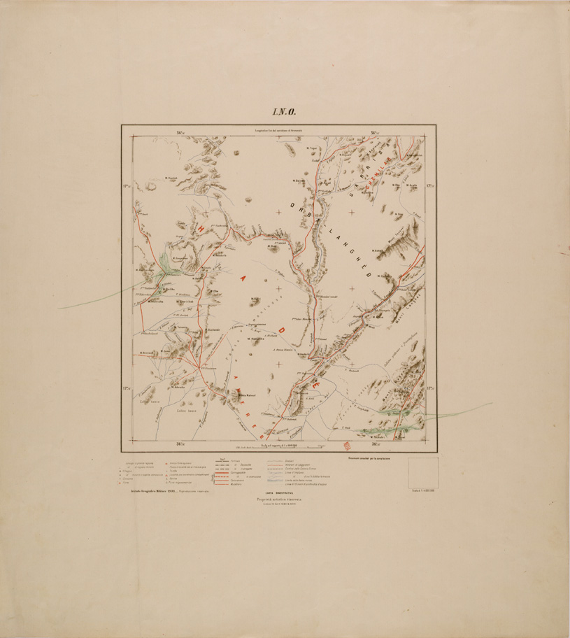 "Carta descrittiva allestita dall'I.G.M. al fine di comprendere i territori rimasti esclusi dai lavori iniziati nella Colonia Eritrea nel 1888. La pubblicazione fu iniziata nel 1897 e ultimata nel 1902. La prima edizione consta di 30 fogli di 1° longitudine per 1° di latitudine e comprende il territorio fra l' 11° e il 16° parallelo e fra il 36° meridiano e il mare. Triangolazioni I.G.M. e determinazioni astronomico-geodetiche dell'Ufficio Topografico della Marina, del geografo D' Abbadie...proiezione policentrica, sostituita dal 1896 con la Cassini, longitudini riferite a Greenwich...in seguito fu allestita una nuova edizione, ampliata al 18° parallelo, per includervi Ras Casar (18°2') e a sud fino all'11° parallelo per la zona ad oriente del 40° meridiano, comprendendo così la regione dell'Aussa ed il territorio adiacente alla baia di Tagiura."