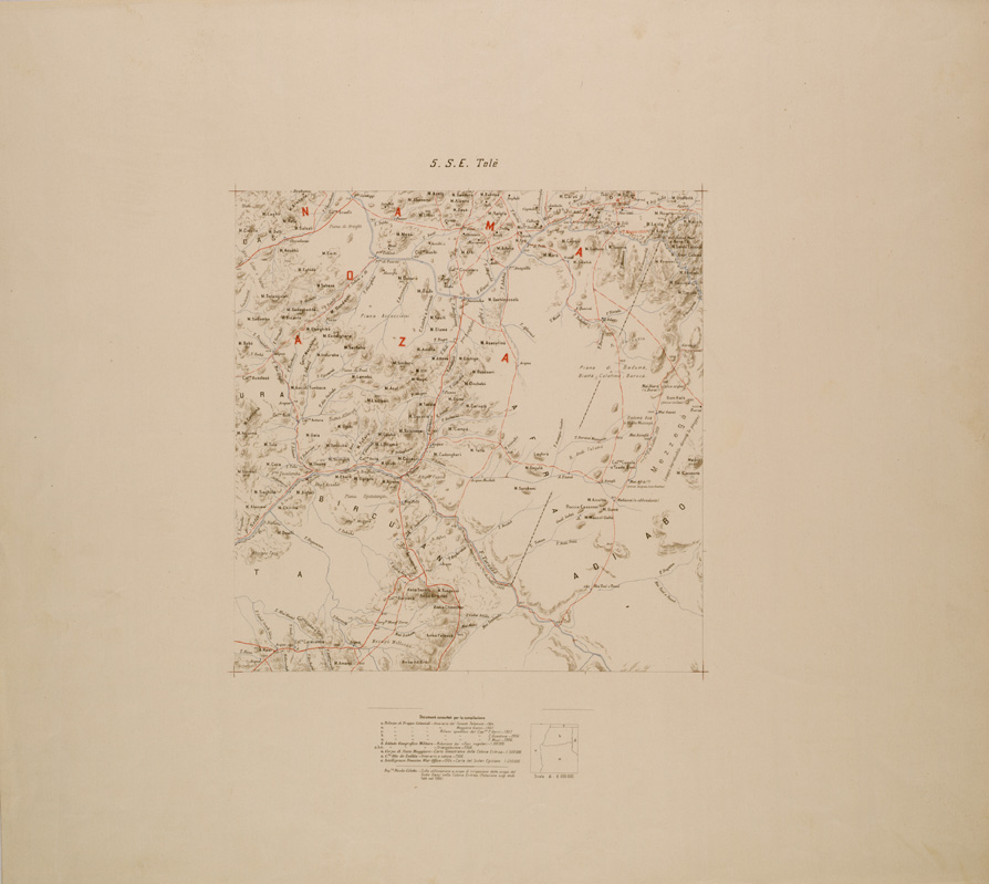 "Carta descrittiva allestita dall'I.G.M. al fine di comprendere i territori rimasti esclusi dai lavori iniziati nella Colonia Eritrea nel 1888. La pubblicazione fu iniziata nel 1897 e ultimata nel 1902. La prima edizione consta di 30 fogli di 1° longitudine per 1° di latitudine e comprende il territorio fra l' 11° e il 16° parallelo e fra il 36° meridiano e il mare. Triangolazioni I.G.M. e determinazioni astronomico-geodetiche dell'Ufficio Topografico della Marina, del geografo D' Abbadie...proiezione policentrica, sostituita dal 1896 con la Cassini, longitudini riferite a Greenwich...in seguito fu allestita una nuova edizione, ampliata al 18° parallelo, per includervi Ras Casar (18°2') e a sud fino all'11° parallelo per la zona ad oriente del 40° meridiano, comprendendo così la regione dell'Aussa ed il territorio adiacente alla baia di Tagiura."