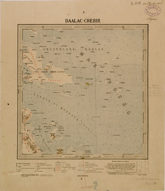"Carta descrittiva allestita dall'I.G.M. al fine di comprendere i territori rimasti esclusi dai lavori iniziati nella Colonia Eritrea nel 1888. La pubblicazione fu iniziata nel 1897 e ultimata nel 1902. La prima edizione consta di 30 fogli di 1° longitudine per 1° di latitudine e comprende il territorio fra l' 11° e il 16° parallelo e fra il 36° meridiano e il mare. Triangolazioni I.G.M. e determinazioni astronomico-geodetiche dell'Ufficio Topografico della Marina, del geografo D' Abbadie...proiezione policentrica, sostituita dal 1896 con la Cassini, longitudini riferite a Greenwich...in seguito fu allestita una nuova edizione, ampliata al 18° parallelo, per includervi Ras Casar (18°2') e a sud fino all'11° parallelo per la zona ad oriente del 40° meridiano, comprendendo così la regione dell'Aussa ed il territorio adiacente alla baia di Tagiura."