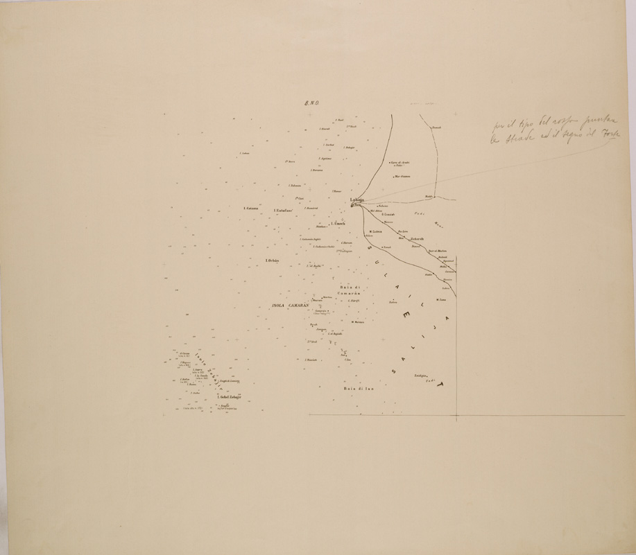 "Carta descrittiva allestita dall'I.G.M. al fine di comprendere i territori rimasti esclusi dai lavori iniziati nella Colonia Eritrea nel 1888. La pubblicazione fu iniziata nel 1897 e ultimata nel 1902. La prima edizione consta di 30 fogli di 1° longitudine per 1° di latitudine e comprende il territorio fra l' 11° e il 16° parallelo e fra il 36° meridiano e il mare. Triangolazioni I.G.M. e determinazioni astronomico-geodetiche dell'Ufficio Topografico della Marina, del geografo D' Abbadie...proiezione policentrica, sostituita dal 1896 con la Cassini, longitudini riferite a Greenwich...in seguito fu allestita una nuova edizione, ampliata al 18° parallelo, per includervi Ras Casar (18°2') e a sud fino all'11° parallelo per la zona ad oriente del 40° meridiano, comprendendo così la regione dell'Aussa ed il territorio adiacente alla baia di Tagiura."