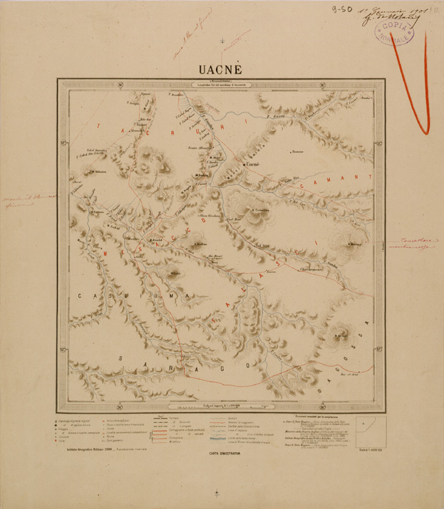 "Carta descrittiva allestita dall'I.G.M. al fine di comprendere i territori rimasti esclusi dai lavori iniziati nella Colonia Eritrea nel 1888. La pubblicazione fu iniziata nel 1897 e ultimata nel 1902. La prima edizione consta di 30 fogli di 1° longitudine per 1° di latitudine e comprende il territorio fra l' 11° e il 16° parallelo e fra il 36° meridiano e il mare. Triangolazioni I.G.M. e determinazioni astronomico-geodetiche dell'Ufficio Topografico della Marina, del geografo D' Abbadie...proiezione policentrica, sostituita dal 1896 con la Cassini, longitudini riferite a Greenwich...in seguito fu allestita una nuova edizione, ampliata al 18° parallelo, per includervi Ras Casar (18°2') e a sud fino all'11° parallelo per la zona ad oriente del 40° meridiano, comprendendo così la regione dell'Aussa ed il territorio adiacente alla baia di Tagiura."