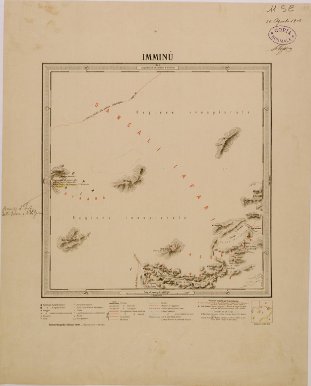 "Carta descrittiva allestita dall'I.G.M. al fine di comprendere i territori rimasti esclusi dai lavori iniziati nella Colonia Eritrea nel 1888. La pubblicazione fu iniziata nel 1897 e ultimata nel 1902. La prima edizione consta di 30 fogli di 1° longitudine per 1° di latitudine e comprende il territorio fra l' 11° e il 16° parallelo e fra il 36° meridiano e il mare. Triangolazioni I.G.M. e determinazioni astronomico-geodetiche dell'Ufficio Topografico della Marina, del geografo D' Abbadie...proiezione policentrica, sostituita dal 1896 con la Cassini, longitudini riferite a Greenwich...in seguito fu allestita una nuova edizione, ampliata al 18° parallelo, per includervi Ras Casar (18°2') e a sud fino all'11° parallelo per la zona ad oriente del 40° meridiano, comprendendo così la regione dell'Aussa ed il territorio adiacente alla baia di Tagiura."