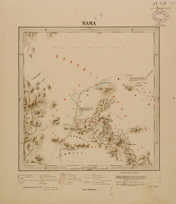 "Carta descrittiva allestita dall'I.G.M. al fine di comprendere i territori rimasti esclusi dai lavori iniziati nella Colonia Eritrea nel 1888. La pubblicazione fu iniziata nel 1897 e ultimata nel 1902. La prima edizione consta di 30 fogli di 1° longitudine per 1° di latitudine e comprende il territorio fra l' 11° e il 16° parallelo e fra il 36° meridiano e il mare. Triangolazioni I.G.M. e determinazioni astronomico-geodetiche dell'Ufficio Topografico della Marina, del geografo D' Abbadie...proiezione policentrica, sostituita dal 1896 con la Cassini, longitudini riferite a Greenwich...in seguito fu allestita una nuova edizione, ampliata al 18° parallelo, per includervi Ras Casar (18°2') e a sud fino all'11° parallelo per la zona ad oriente del 40° meridiano, comprendendo così la regione dell'Aussa ed il territorio adiacente alla baia di Tagiura."