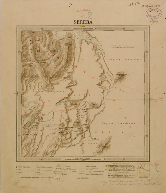 "Carta descrittiva allestita dall'I.G.M. al fine di comprendere i territori rimasti esclusi dai lavori iniziati nella Colonia Eritrea nel 1888. La pubblicazione fu iniziata nel 1897 e ultimata nel 1902. La prima edizione consta di 30 fogli di 1° longitudine per 1° di latitudine e comprende il territorio fra l' 11° e il 16° parallelo e fra il 36° meridiano e il mare. Triangolazioni I.G.M. e determinazioni astronomico-geodetiche dell'Ufficio Topografico della Marina, del geografo D' Abbadie...proiezione policentrica, sostituita dal 1896 con la Cassini, longitudini riferite a Greenwich...in seguito fu allestita una nuova edizione, ampliata al 18° parallelo, per includervi Ras Casar (18°2') e a sud fino all'11° parallelo per la zona ad oriente del 40° meridiano, comprendendo così la regione dell'Aussa ed il territorio adiacente alla baia di Tagiura."