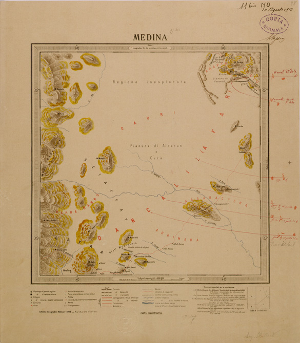"Carta descrittiva allestita dall'I.G.M. al fine di comprendere i territori rimasti esclusi dai lavori iniziati nella Colonia Eritrea nel 1888. La pubblicazione fu iniziata nel 1897 e ultimata nel 1902. La prima edizione consta di 30 fogli di 1° longitudine per 1° di latitudine e comprende il territorio fra l' 11° e il 16° parallelo e fra il 36° meridiano e il mare. Triangolazioni I.G.M. e determinazioni astronomico-geodetiche dell'Ufficio Topografico della Marina, del geografo D' Abbadie...proiezione policentrica, sostituita dal 1896 con la Cassini, longitudini riferite a Greenwich...in seguito fu allestita una nuova edizione, ampliata al 18° parallelo, per includervi Ras Casar (18°2') e a sud fino all'11° parallelo per la zona ad oriente del 40° meridiano, comprendendo così la regione dell'Aussa ed il territorio adiacente alla baia di Tagiura."