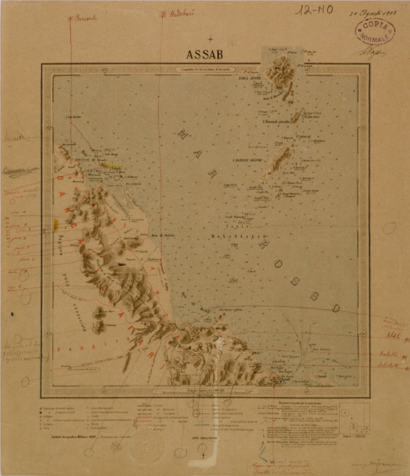 "Carta descrittiva allestita dall'I.G.M. al fine di comprendere i territori rimasti esclusi dai lavori iniziati nella Colonia Eritrea nel 1888. La pubblicazione fu iniziata nel 1897 e ultimata nel 1902. La prima edizione consta di 30 fogli di 1° longitudine per 1° di latitudine e comprende il territorio fra l' 11° e il 16° parallelo e fra il 36° meridiano e il mare. Triangolazioni I.G.M. e determinazioni astronomico-geodetiche dell'Ufficio Topografico della Marina, del geografo D' Abbadie...proiezione policentrica, sostituita dal 1896 con la Cassini, longitudini riferite a Greenwich...in seguito fu allestita una nuova edizione, ampliata al 18° parallelo, per includervi Ras Casar (18°2') e a sud fino all'11° parallelo per la zona ad oriente del 40° meridiano, comprendendo così la regione dell'Aussa ed il territorio adiacente alla baia di Tagiura."